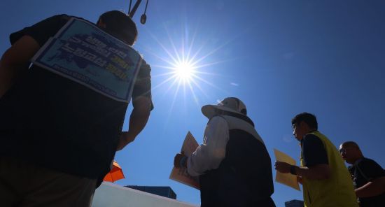 11일 서울 종로구 정부서울청사 앞에서 정부 규제개혁위원회(규개위)의 폭염 규칙 통과 촉구 기자회견을 하는 민주노총 조합원 위로 뙤약볕이 내리쬐고 있다. 연합뉴스 |