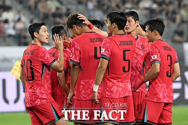 홍콩과 2025 동아시아축구연맹(EAFF) E-1 챔피언십(동아시안컵) 2차전에 나설 한국 남자 축구 국가대표팀 선발 명단이 공개됐다. 사진은 지난 7일 용인미르스타디움에서 열린 동아시안컵 한국-중국 1차전에서 후반 김주성의 득점 후 동료들이 축하하는 모습. /용인미르스타디움=남용희 기자