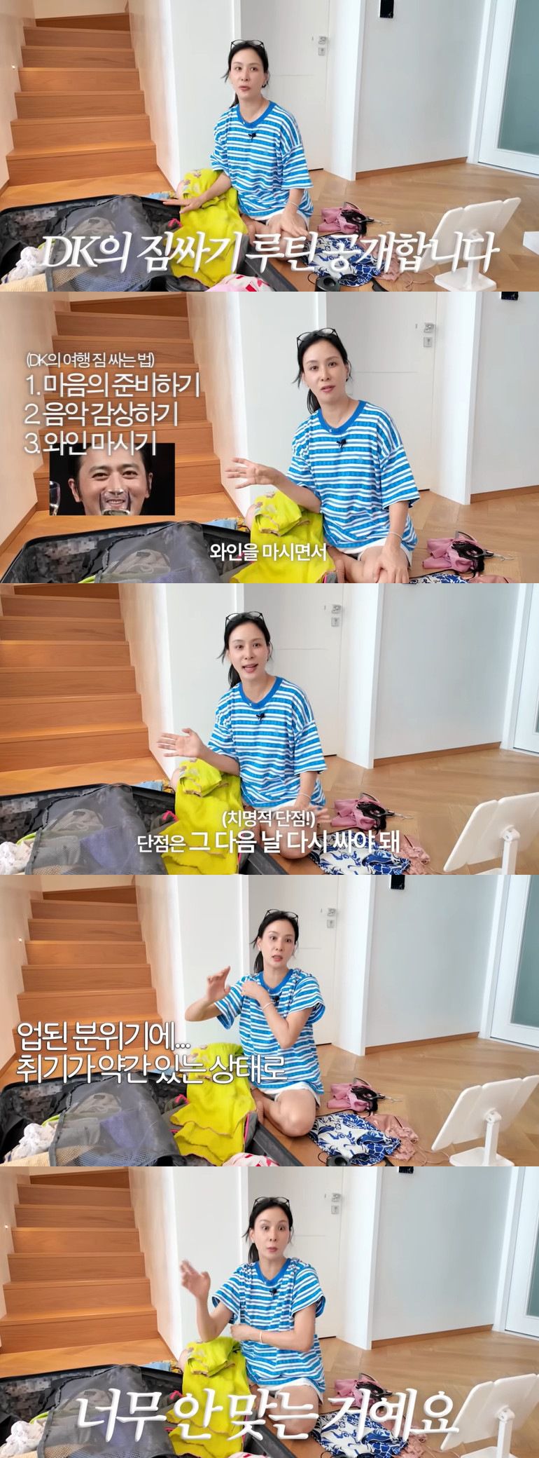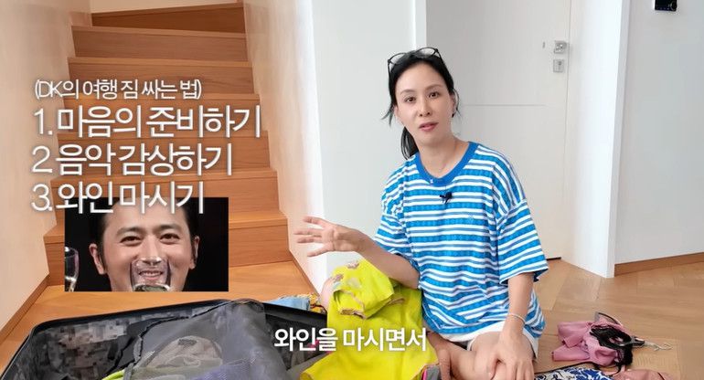장동건은 여행 전날 마음의 준비를 하고, 음악을 틀어 놓은 후 와인을 마시면서 즐기면서 짐을 싼다고. 고소영은 "단점은 그다음 날 다시 싸야 된다. 업된 분위기에 취기가 약간 있는 상태로 싸니까 너무 안 맞는 거다"라고 말해 웃음을 자아냈다.