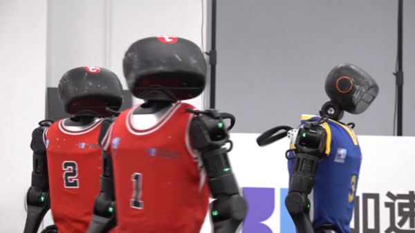 칭화대학교와 중국농업대학교에서 나온 두 팀이 3대 3 AI 로봇 축구 훈련 경기를 진행했습니다.