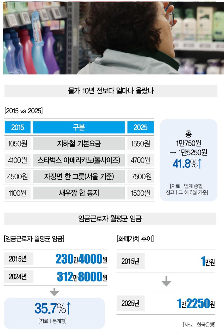 물론 10년 전과 비교해 물가가 오르는 건 자연스러운 현상이다. 하지만 직장인의 월급은 찔끔 올랐다. 고용노동부에 따르면 상용근로자(1인 이상 사업체 기준) 월평균 실질임금은 2015년 315만3000원에서 2024년 357만2000원으로 13.2% 오르는 데 그쳤다.[※참고: 2025년 실질임금은 아직 통계 발표 전으로 2015년과 2024년을 비교했다.]