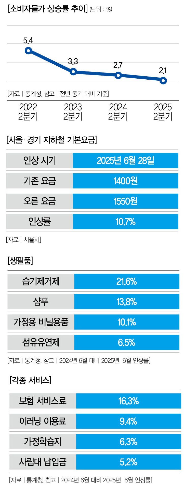 하지만 그것만으론 고물가를 잠재우기 어렵다는 목소리도 적지 않다. 오른 게 가공식품만이 아니라서다. 앞서 언급했던 지하철 요금이 대표적이다. 지난 6월 28일을 기점으로 수도권 지하철 기본요금이 기존 1400원에서 1550원으로 10.7% 올랐다. 2023년 10월 이후 1년 8개월만의 가격 인상이다.