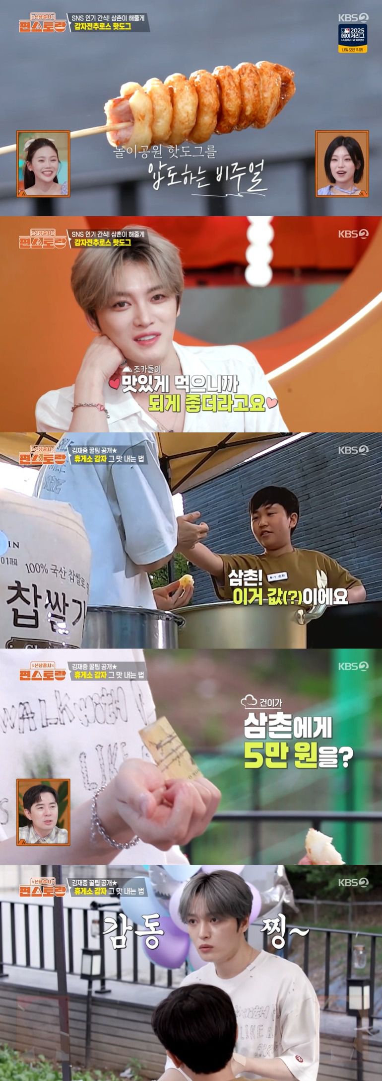 이날 본가 마당에 대형 야외 풀장을 설치해 가족들과 시간을 보내던 김재중은 놀고 있는 조카들 옆에서 탕후루와 감자전추로스 핫도그를 만들었다.