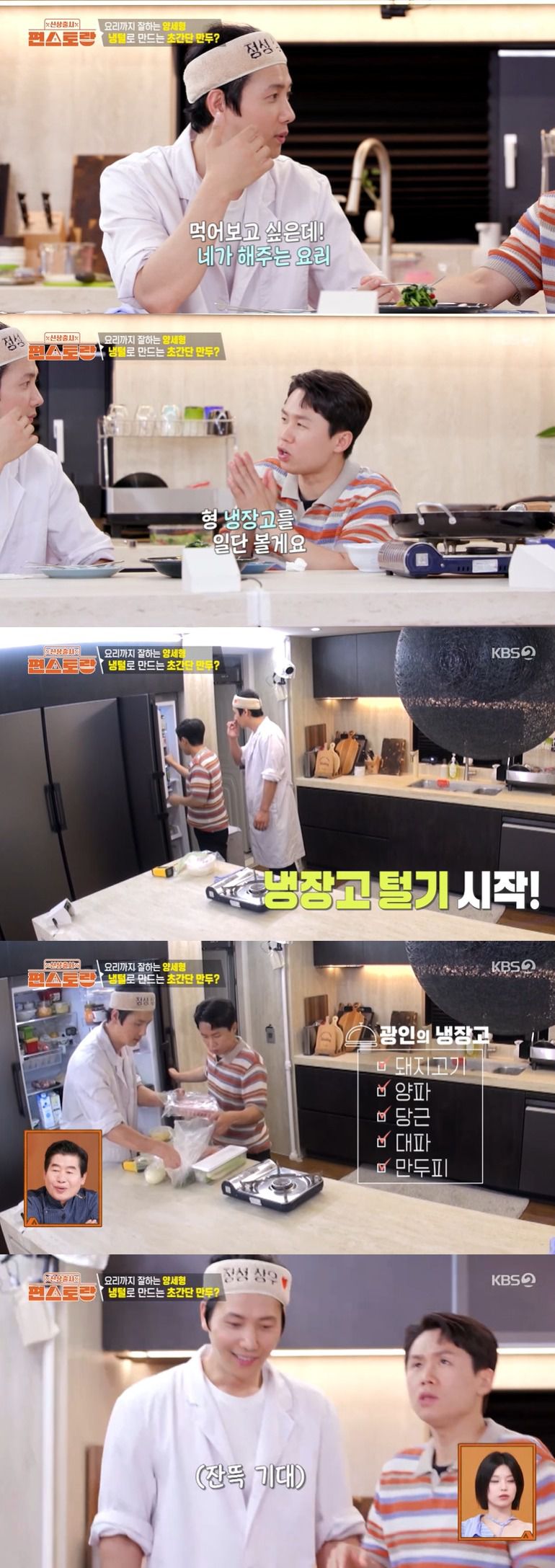 이에 양세형은 "형 냉장고를 일단 볼게요"라고 말한 뒤 냉장고를 털기 시작했고, 이어 돼지고기와 양파, 당근, 대파, 만두피를 꺼냈다.