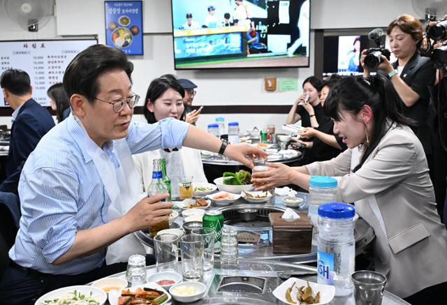 이재명 대통령이 11일 서울 종로구의 한 식당에서 가진 외식 행사에서 직원들에게 술을 따라주고 있다. 왕태석 선임기자 |