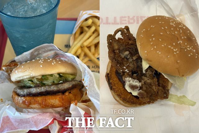 롯데리아가 최근 '김치불고기버거'(왼쪽)와 '오징어 얼라이브 버거'를 출시했다. /문화영 기자 |