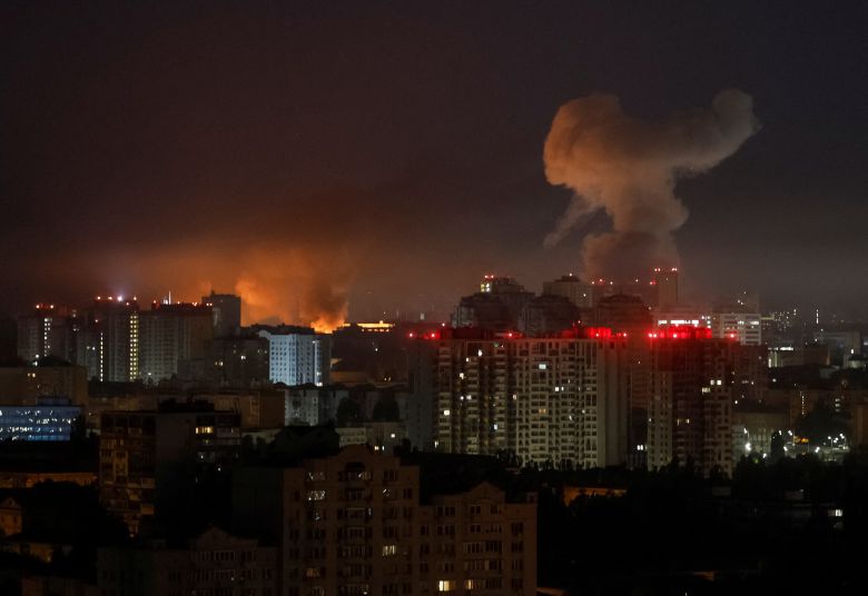 10일 새벽 우크라이나 수도 키이우 상공 곳곳에서 러시아군의 공격 폭발해 불꽃과 연기를 내뿜고 있다. 이날 러시아는 미사일 18발과 드론 약 400기를 우크라 전역에 퍼붓는 대규모 공습을 감행해 민간인 12명이 숨졌다. /로이터 연합뉴스 |