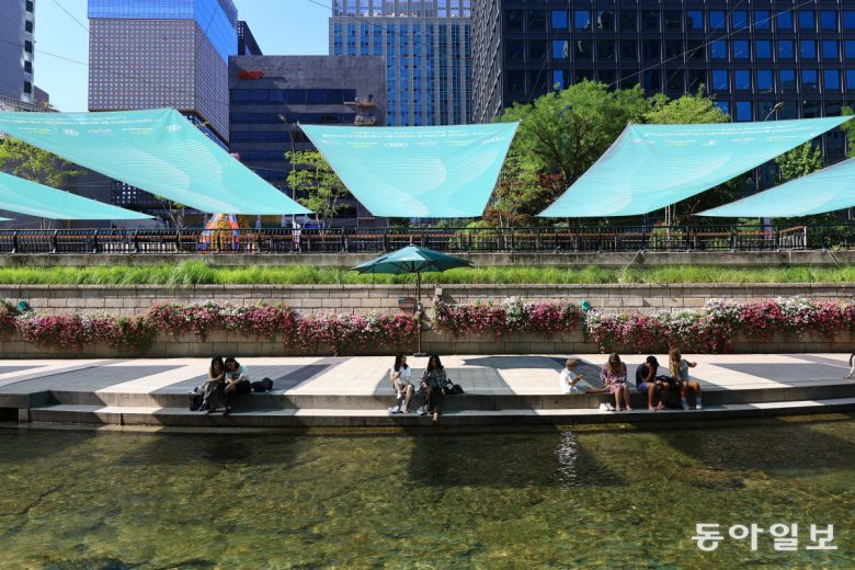 청계천 그늘막 밑에 옹기종기 11일 서울 중구 청계천 모전교와 광통교 사이 구간에 설치된 그늘막 아래에 시민들이 모여 앉아 휴식을 취하고 있다. 서울시설공단은 폭염 속 청계천을 찾는 시민들을 위해 그늘막을 설치했다고 밝혔다. 전영한 기자 scoopjyh@donga.com |