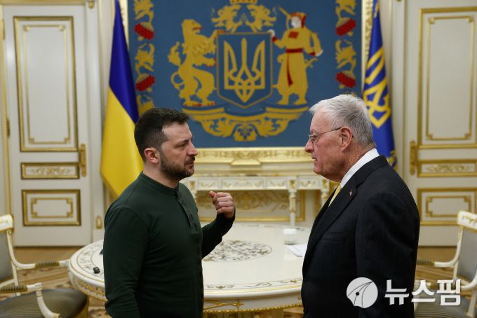 대화하는 볼로도미르 젤렌스키 우크라이나 대통령(왼쪽)과 키스 켈로그 미국 특사. [사진=로이터 뉴스핌] |