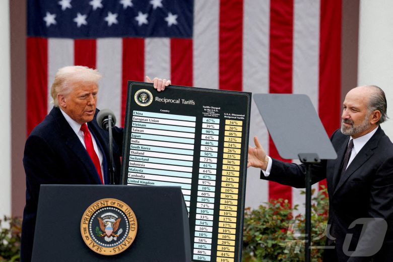 도널드 트럼프 미국 대통령이 지난 4월 2일 미국 워싱턴DC 백악관 로즈가든에서 하워드 러트닉 상무장관의 도움을 받아 국가별 상호관세율을 표시한 차트를 들어보이고 있다. ⓒ 로이터=뉴스1 ⓒ News1 류정민 특파원 |