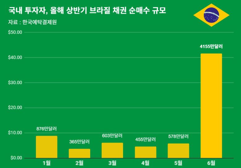 국내 투자자는 브라질 채권을 이달 현재까지 20개월 연속 ‘사자’ 중이다. 특히 지난달 순매수 규모는 4155만달러(약 570억원)로 월간 기준 2017년 3월 이후 가장 컸다.