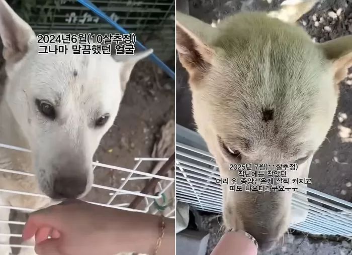 그러면서 “그나마 옆에 정육점 사장님이 가끔 배설물 치워주고 물도 갈아주고 사료도 부어주셔서 이 개가 목숨은 유지하고 있었다”며 “지난해 10살로 추정된 이 백구는 그나마 얼굴이 말끔했는데 1년이 지난 지금 머리 위 종양 같은 게 살짝 커지고 피도 나더라”라고 안타까워했다.