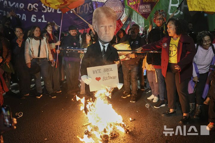 [상파울루=AP/뉴시스] 10일(현지 시간) 브라질 상파울루에서 시위대가 도널드 트럼프 미국 대통령의 인형을 불태우고 있다. 시위대는 트럼프 대통령이 브라질산 제품에 대해 50% 관세를 결정한 것에 분노해 시위를 벌였다. 2025.07.12. |