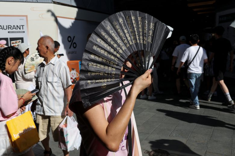 중국 상하이에서 4일 한 시민이 부채로 얼굴을 가리고 있다. 중국에서 가계부채 위기가 심화하고 있다. 영국 경제 주간지 이코노미스트는 빚을 갚지 못하는 중국인들이 단순 연체자 포함 최대 8300만 명에 이른다고 추산했다.
