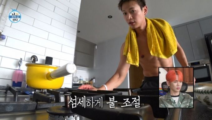 그러더니 갑자기 집을 허겁지겁 뛰어다니기 시작했다. 민호는 "허기진 배를 풍족하게 달래줄 저만의 라면 챌린지"라며 "물을 올리고 라면을 넣는 순간 샤워를 시작한다. 빨리 씻고 빨리 먹고 싶은 마음을 하이브리드로 합쳤다. 6분 만에 끝내고 먹는 완벽한 챌린지"라고 설명했다.