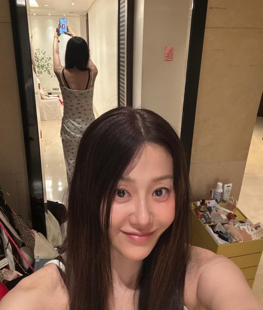 두 번째 컷에서는 거울에 등을 돌린 채, 뒷모습까지 연출한 반전 셀카가 담겼다. 얇은 끈 원피스에 드러난 어깨 라인, 팔뚝의 힘 빠진 각도, 그리고 앞에서는 말없이 웃고 있는 얼굴. 카메라는 단순한 셀카를 넘어서, 지금 그녀의 시간을 보여주고 있었다.