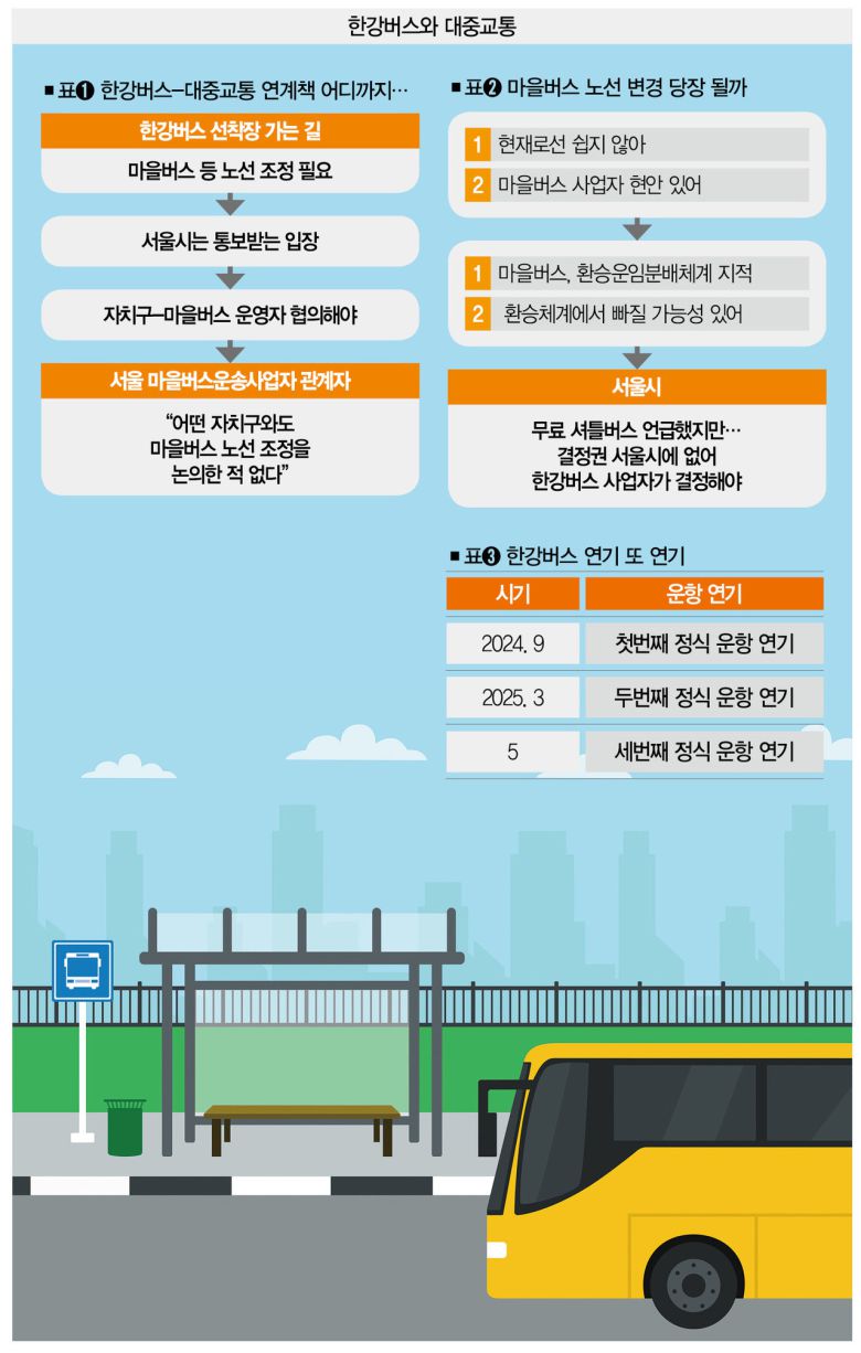 세 차례나 미뤄졌던 한강버스 정식운항까지 이제 2개월밖에 남지 않았다(표③). 그런데도 한강버스의 성공 요인 중 하나인 '대중교통 연계책'은 아직 마침표가 찍히지 않았다. 서울시는 '한강버스 9월 출항'을 아무런 문제 없이 진행할 수 있을까.