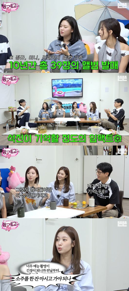 정연은 "10년 솔직히 실감 안 난다. 저희가 10년 동안 계속 앨범을 내서 20대가 너무 빨리 갔다. 제가 30살인 게 믿기지 않는다. 받아들이기 힘들다. 아깝다"라고 밝혔다. 실제 트와이스는 데뷔 이후 10년 동안 정규, 미니, 리패키지 앨범만 39장을 발매하며 쉬지 않고 활동했다.