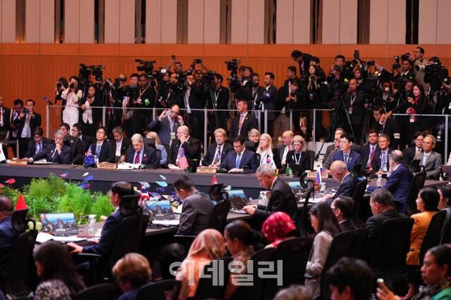 한편 성명은 미국과 중국이 강하게 대립했던 남중국해 분쟁에 대해서는 지난해와 마찬가지로 “일부 장관들이 신뢰를 약화하고 긴장을 고조시키며 역내 평화와 안보, 안정을 훼손하는 토지 매립 등의 활동과 심각한 상황에 대해 우려를 표시했다”고 밝혔다. 다만 중국이나 필리핀 등 구체적인 국가이름은 명시하지는 않았다.