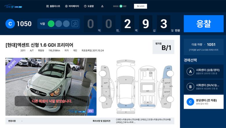 11일에는 총 1271대(분당센터 444대·시화센터 827대)가 출품됐다. 경매는 오후 1시부터 시작됐으며, 엑센트는 분당센터의 50번째 상품으로 출품됐다.