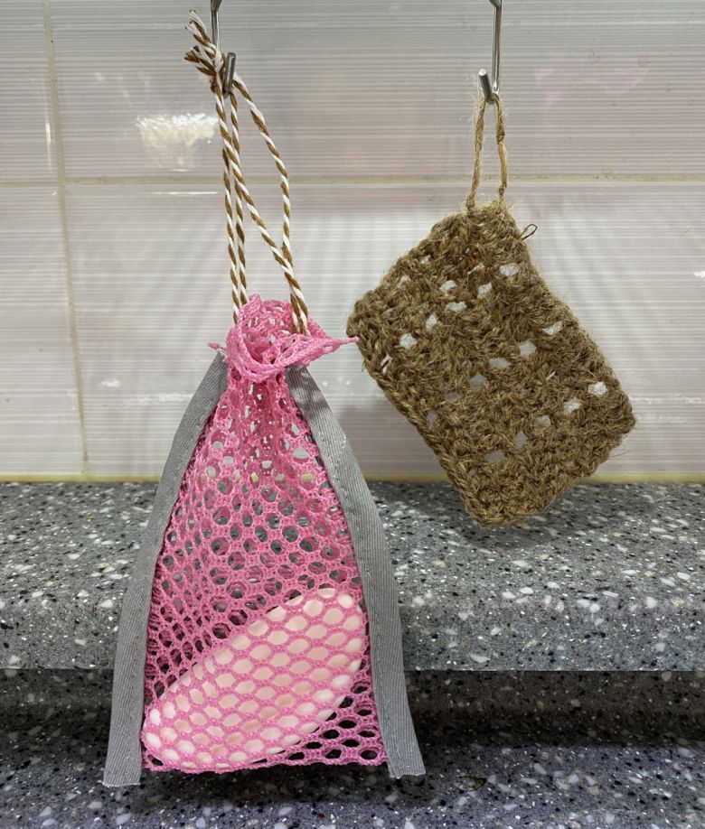 더 이상 쓰지 않는 수세미로 만든 비누망(왼쪽)과 마로 짠 천연 수세미. |