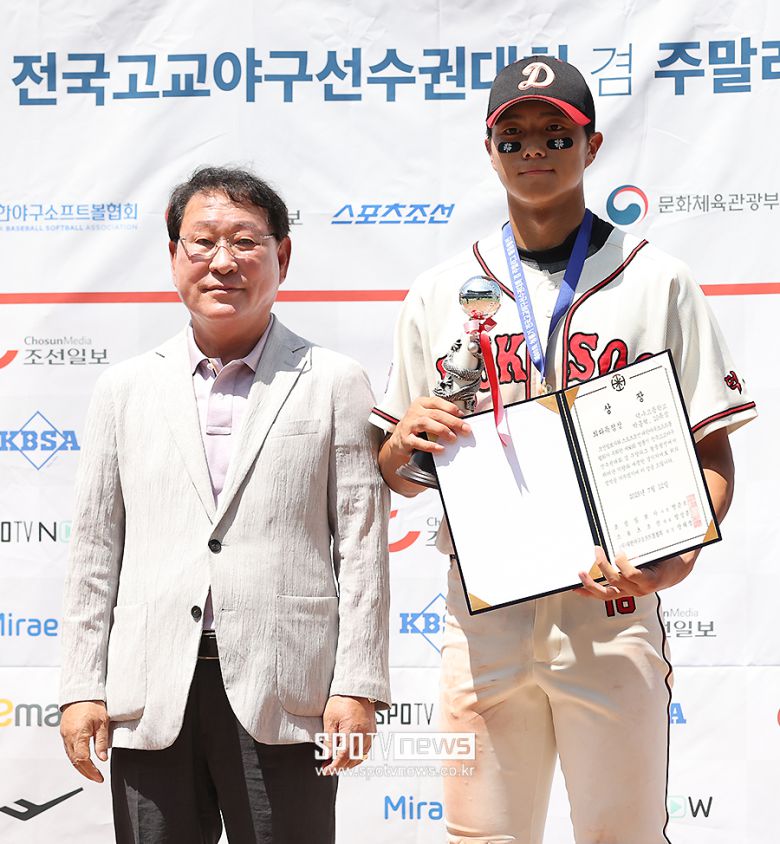 [스포티비뉴스=목동, 곽혜미 기자] '제80회 청룡기 전국고교야구선수권대회' 덕수고와 부산고의 결승전이 12일 오전 서울 양천구 목동야구장에서 열렸다. 우승을 거둔 덕수고 박종혁이 최다득점상을 받으며 기념 촬영을 하고 있다. <저작권자 ⓒ SPOTV NEWS. 무단전재 및 재배포 금지>이 기사의 카테고리는 언론사의 분류를 따릅니다.0공유하기