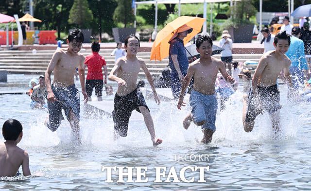 [더팩트ㅣ이새롬 기자] 서울 낮 최고기온이 36도까지 오른 12일 오후 서울 여의도 한강공원 물빛광장을 찾은 학생들이 물놀이를 하며 더위를 식히고 있다.