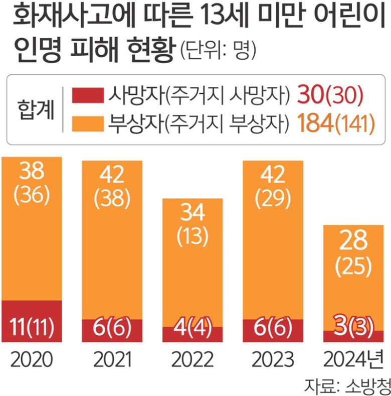 어린이 화재 피해는 대부분 집에서 발생한다. 소방청의 ‘최근 5년간(2020∼2024년) 발화 장소에 대한 피해 연령별 인명피해 현황’ 자료에 따르면 13세 미만 어린이 화재 피해자 214명 중 171명(71.25%)이 가정에서 발생한 화재로 숨지거나 부상을 당했다. 화재로 숨진 어린이 30명은 모두 가정에서 일어난 화재 탓에 목숨을 잃었다. 복지부의 2023년 아동종합실태조사를 보면, ‘거의 매일 혼자 집에 있다’고 응답한 9~11세 아동은 6.6%에 달했다. 10년 전인 2013년 6.1%보다 늘었다.