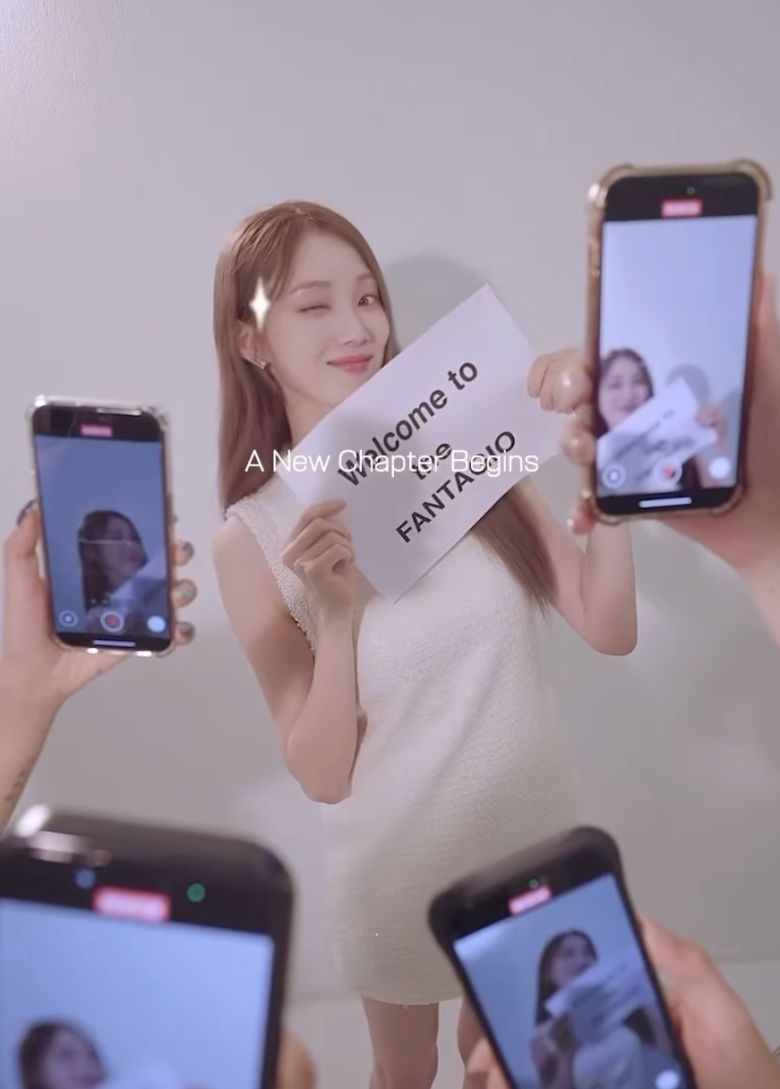 이성경은 '웰컴 투 더 판타지오'(Welcome to the FANTAGIO)라는 문구가 적힌 종이를 손에 쥐고 있었다. 활짝 미소 지으며 포즈를 취했다.
