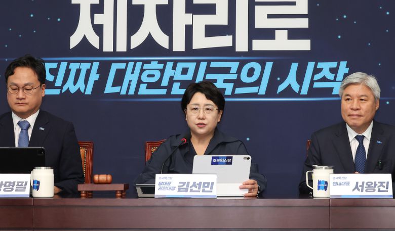 ▲ 조국혁신당 김선민 당 대표 권한대행(가운데)이 23일 국회에서 열린 최고위원회의에서 발언하고 있다.