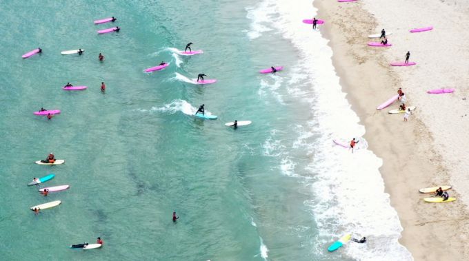 강원 양양군 현남면 인구 해수욕장을 찾은 시민들이 서핑을 즐기고 있다./사진=뉴스1 |