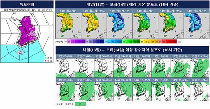 12일 오후 4시 기준 특보현황(왼쪽) 및 13~14일 예상 기온과 예상 강수지역 분포도.[그래픽=기상청]2025.07.12 nulcheon@newspim.com |