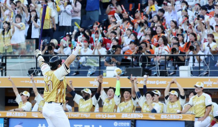 박동원은 12일 대전 한화생명 볼파크에서 열린 2025 신한SOL뱅크 KBO올스타전 1회말 홈런을 터뜨렸다.