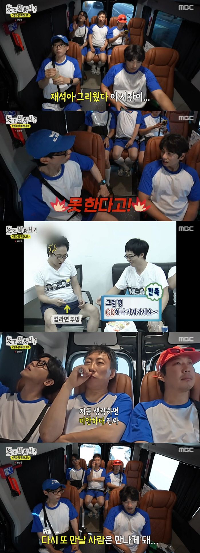이와 함께 공개된 '무한도전' 영상에서는 연습을 거부하는 박명수와 깐족거리는 유재석의 장면이 나왔다. 당시 박명수는 에어로빅 연습을 더 하자는 멤버들의 말에 "가서 아기 봐야 한다. CD 구워 가서 따로 연습하겠다"고 말했다. 그러자 유재석은 CD 대신 컵라면 뚜껑을 건네며 깐족거렸고, 폭발한 박명수는 컵라면 뚜껑으로 유재석의 머리를 때렸다.