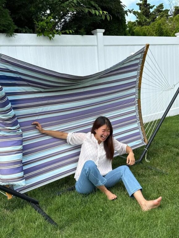 공개된 사진에는 미국에서 여유로운 시간을 보내고 있는 이시영의 모습이 담겼다. 해먹에서 떨어져 함박 웃음을 보이고 있다.