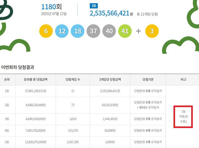 제1180회 로또복권 당첨번호 조회 결과 1등 당첨은 11명이다. 1등 당첨금은 25억3556만원. 1등 당첨 구매 방식은 자동 10명, 수동 1명이다. /동행복권 캡처