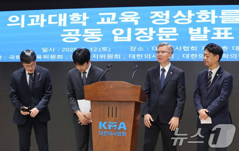(서울=뉴스1) 신웅수 기자 = 박주민 국회 보건복지위원장(왼쪽부터), 이선우 대한의과대학·의학전문대학원학생회 비상대책위원장, 김택우 대한의사협회장, 김영호 교육위원장이 12일 오후 서울 용산구 대한의사협회에서 의과대학 교육 정상화를 위한 공동 성명서를 발표한 후 인사하고 있다. 윤석열 정부의 의과대학 정원 확대 추진 등 의료 개혁 정책에 반발해 학교를 떠났던 의대생들이 전원 복귀하겠다는 뜻을 밝혔고 국회는 의대 교육의 정상화를 적극 지원하겠다고 약속했다. 2025.7.12/뉴스1