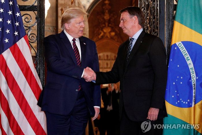 2020년 3월 마러라고에서 만나 악수하는 트럼프 대통령 (왼쪽)과 보우소나루. 로이터 연합뉴스