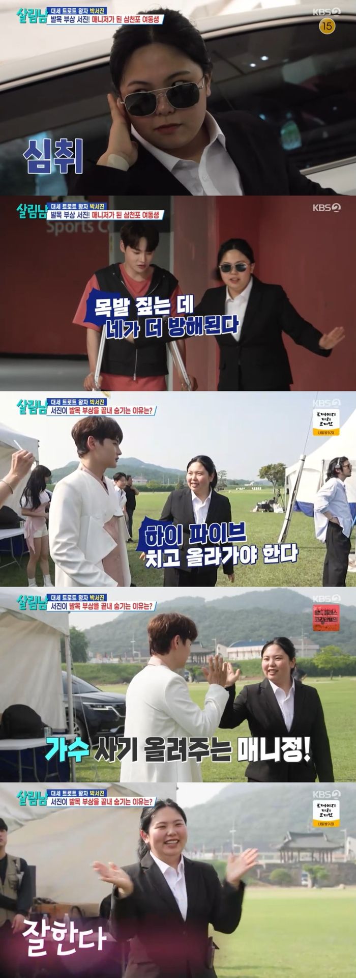 운전석에 탄 효정은 일일 매니저답게 서진을 위한 목베개, 거울, 물, 손풍기, 무전기, 곰국, 깁스용 신발을 준비했다. 서진은 아픈 다리를 걱정하는 효정에게 “관객들은 날 보려고 온 건데 어떻게 안 뛰는데? 아파도 참고 해야지. 그게 프로 아이가?”라고 했다.