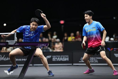 WTT 미국 스매시 경기를 벌이는 임종훈(왼쪽)과 신유빈