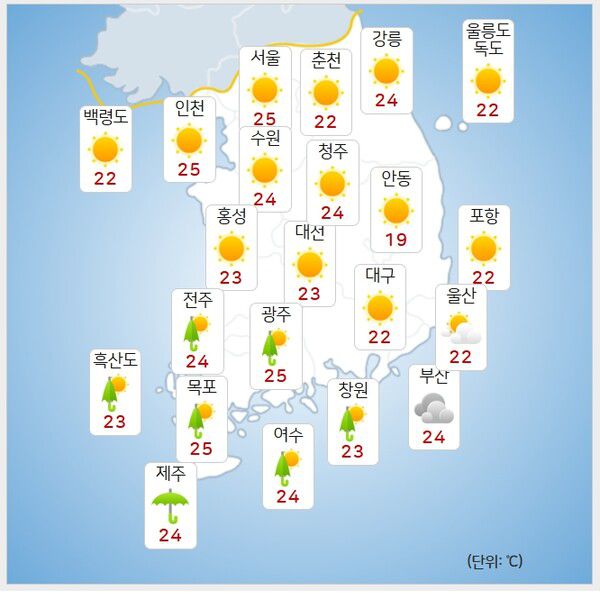 전국 주요 도시별 예상 최저 기온은 △서울 25도 △인천 25도 △춘천 22도 △강릉 24도 △대전 23도 △대구 22도 △전주 24도 △광주 25도 △부산 24도 △제주 24도 △울릉도 독도 22도다.