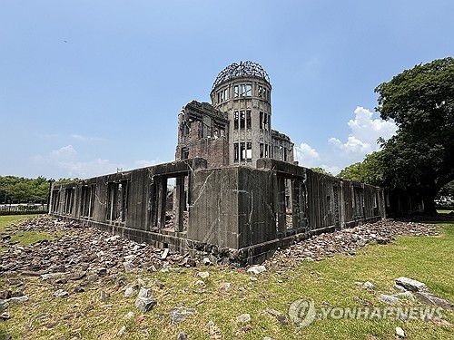 (히로시마=연합뉴스) 박상현 특파원 = 1945년 8월 6일 미국이 일본 히로시마에 원자폭탄을 투하했을 때 파괴된 '원폭돔'에 당시 잔해가 남아 있다. 이 건물은 1915년 지어져 히로시마현 산업장려관으로 활용됐다. 원폭 투하 지점과는 160m 떨어져 있으며 유네스코 세계유산으로 등재됐다. 올해는 히로시마와 나가사키에 원자폭탄이 투하된 지 80년이 되는 해다. 사진은 지난 8일 모습. 2025.7.13