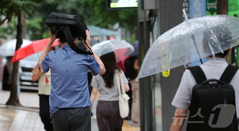 비가 내리는 8일 오후 서울 서대문역 인근에서 우산을 준비 못한 한 시민이 가방으로 머리를 가리며 이동하고 있다. 2025.7.8/뉴스1 ⓒ News1 김진환 기자 |