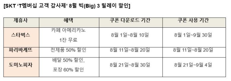SK텔레콤이 다음 달 스타벅스와 파리바게뜨, 도미노피자 등 제휴사 3곳에 대한 할인 혜택을 제공하는 ‘T 멤버십 고객 감사제’를 진행한다고 13일 밝혔다.