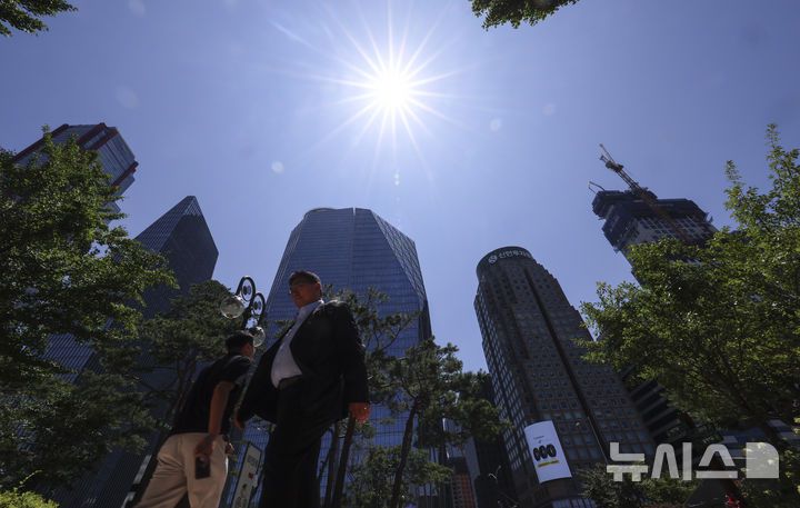 [서울=뉴시스] 김근수 기자 = 연일 폭염이 계속되는 가운데 11일 서울 영등포구 여의도 공원에서 직장인들이 점심식사를 하기 위해 이동하고 있다. 2025.07.11. ks@newsis.com