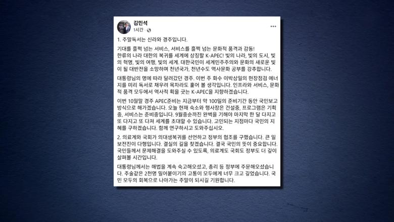 김 총리는 오늘(13일) SNS에, 국민께서 문제 해결을 도와주실 수 있도록 의료계도, 국회도, 정부도 더 깊이 살펴볼 시간이라며 이같이 적었습니다.