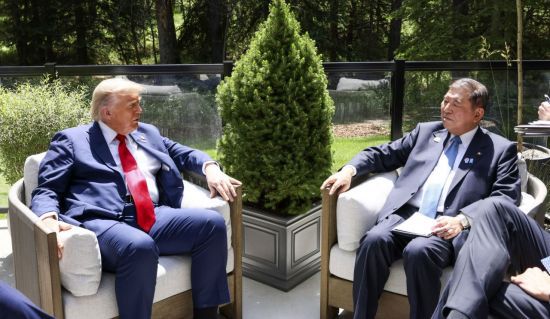 도널드 트럼프 미국 대통령과 이시바 시게루 일본 총리가 주요 7개국(G7) 정상회의를 계기로 캐나다 캐내내스키스에서 회담하고 있다. 연합뉴스