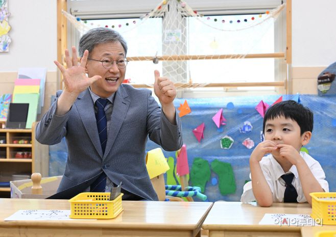 장인홍 구로구청장이 취임 100일인 지난 11일 서울 구로구청 사랑채움 어린이집을 찾아 일일교사로 아이들과 종이접기를 하고 있다. 장 구청장은 민선8기 제21대 구로구청장 취임 100일을 맞아 이날 새벽 환경공무관 격려를 시작으로, 골목청소, 경로당 방문, 어린이집 일일교사 체험, 빗물펌프장 점검 등 현장에서 구민과 소통하며 실질적인 구정 운영을 이어갔다. /정재훈 기자 |