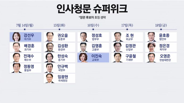 이재명 정부 1기 내각 구성을 위한 인사청문회가 이번 주에 본격 진행됩니다. 내일부터 18일까지,16명의 초대 장관 후보자가 나서는데요. 최창렬 용인대 특임교수,김철현 경일대 특임교수와청문회 슈퍼위크 주요 관전 포인트 짚어보겠습니다. 어서 오십시오. 강훈식 대통령실 비서실장이 어제자신의 SNS에 이런 글을 남겼습니다. 1기 내각 추천이 끝났는데,이 대통령의 눈이 너무 높다. 우선 초대 내각, 19개 부처 장관 후보자 지명이 마무리됐는데 두 분은 어떻게 평가하십니까? 먼저 최 교수님.