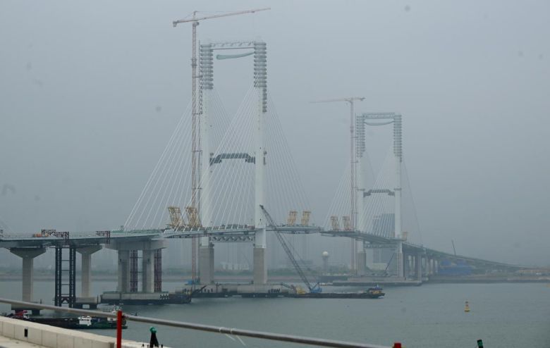이달 7일 인천 중구 영종도와 서구 청라국제도시를 잇는 ‘제3연륙교’의 막바지 공사가 한창이다. 제3연륙교는 올해 말 개통을 앞두고 있지만 인천시와 국토교통부의 갈등 속에 여전히 통행료가 정해지지 않았다. 인천시 제공 |